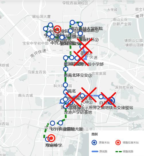 取消站点:双方向取消“科发路、深南科技立交北、科技园②、深大北门②、深圳大学、南山区委、市六医院、桃园南新路口、大新地铁站、大新村、阳光棕榈园”等11对公交停靠站,往世界之窗地铁公交接驳站方向取消“松坪村、朗山路中、阜外深圳医院”等3个单边公交停靠站,往动物园总站方向取消“深大地铁站、中兴通讯①、创维大厦、清华信息港、北环铜鼓天桥、松坪山”等6个单边公交停靠站。