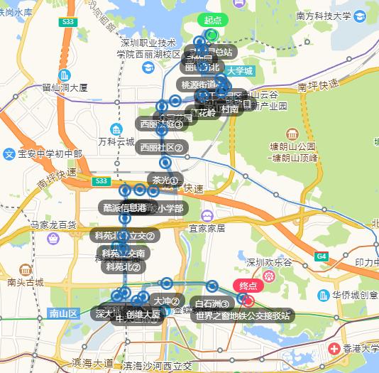 增加站点:双方向增加“高科技中心、深港产学研基地、百度国际大厦、软件产业基地、学府中学、海岸城”等6对公交停靠站。