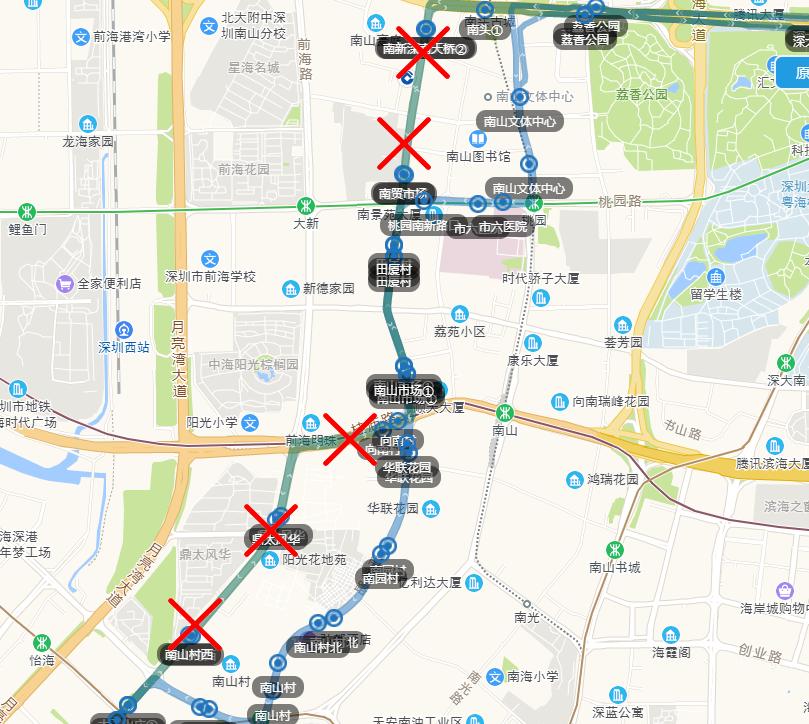取消站点:取消“南山村西、鼎太风华、向南村、南贸市场、南新深南天桥②”等5对公交停靠站,取消“南头①(南侧)、荔香公园(北侧)”等2个单边公交停靠站。