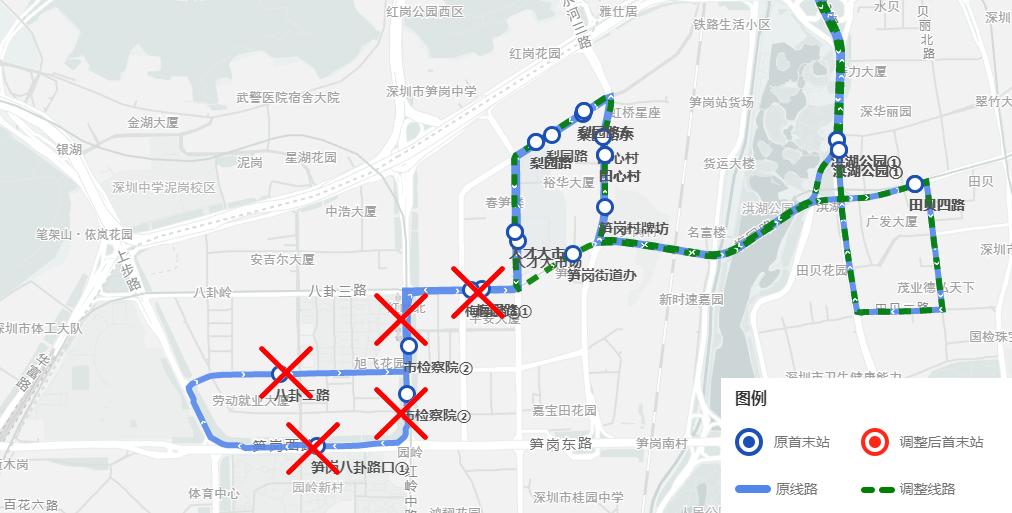 取消站点:取消“梅园路①、市检察院②”等2对公交停靠站,取消“笋岗村牌坊(西侧)、田心村(西侧)、梨园路东(南侧)、梨园路(南侧)、人才大市场(东侧)、笋岗八卦路口①(北侧)、八卦二路(南侧)”等7个单边公交停靠站。