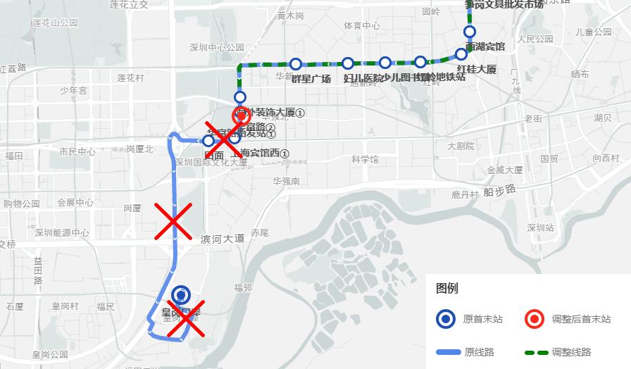 一端总站由福田交通枢纽公交场站调整为华强路地铁公交接驳站。
