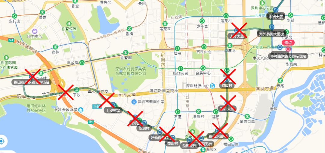 取消站点:双方向取消“沙尾、新洲村、妇幼保健院、益田村、益田花园、福田水围天桥、福田水围村、高训大厦、岗厦村、人才大厦”等10对公交停靠站,往华强路地铁公交接驳站方向取消“上沙村②”1个单边公交停靠站,往坂田象角塘总站方向取消“海滨生态体育公园东、上沙、上沙村”等3个单边公交停靠站。