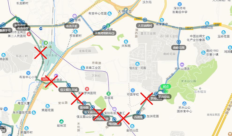 双方向取消“宝安纯中医医院、布吉汽车站”等2对公交停靠站。