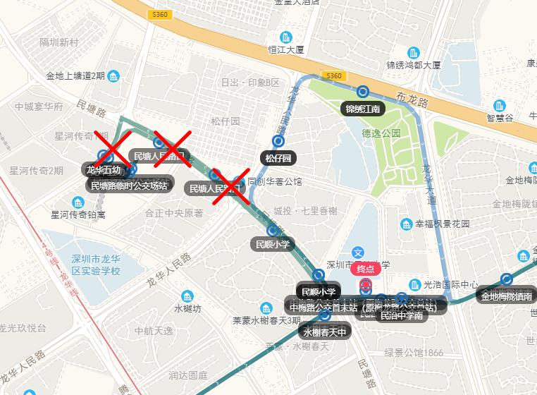 顺时针方向取消“龙华五幼、民塘人民路口”等2对公交停靠站及“民顺小学、民治中学南(南侧)、民塘人民路口”等3个单边公交停靠站,增加“松仔园、锦绣江南”等2对公交停靠站及“民治中学南(北侧)”1个单边公交停靠站。