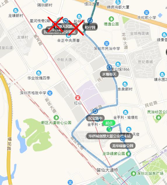 逆时针方向取消“龙华五幼、民塘人民路口、民顺小学”等3对公交停靠站。