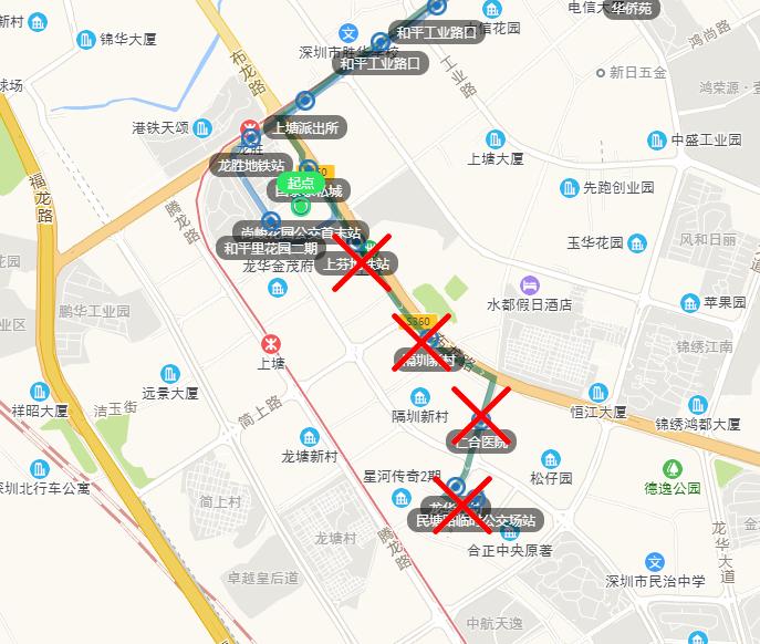 双方向取消“上芬地铁站、隔圳新村、仁合医院、龙华五幼”等4对公交停靠站,往大浪新百丽总站方向增加“和平里花园二期、龙胜地铁站”等2个单边公交停靠站。