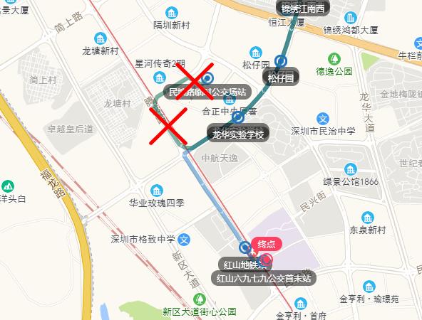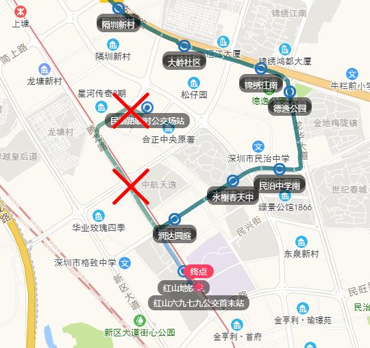 双方向取消“龙华五幼、民塘人民路口”等2对公交停靠站,增加“水榭春天”1对公交停靠站。