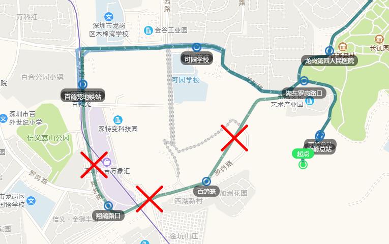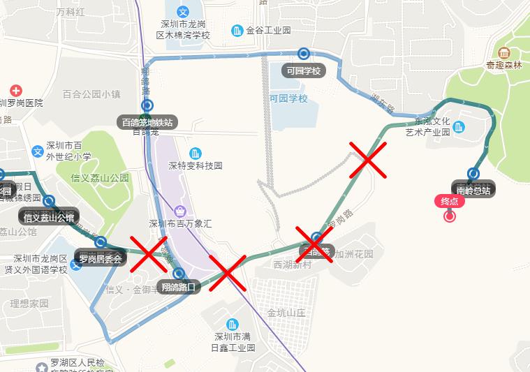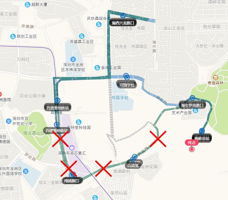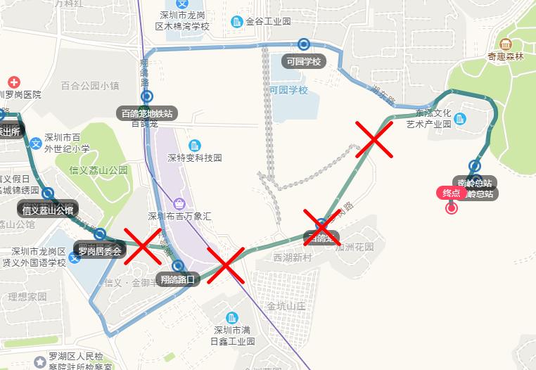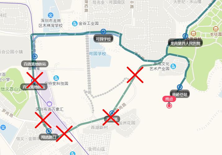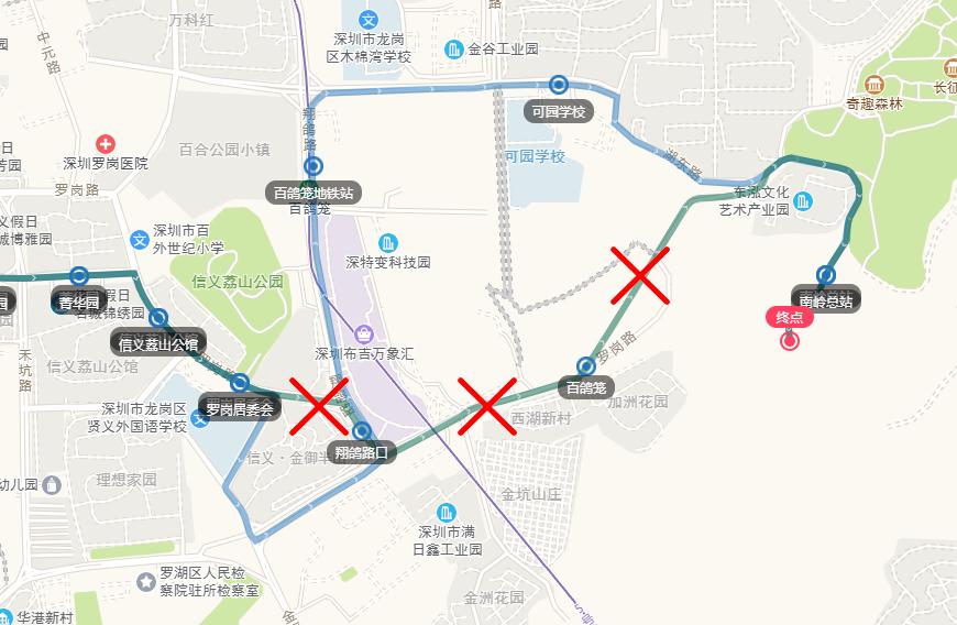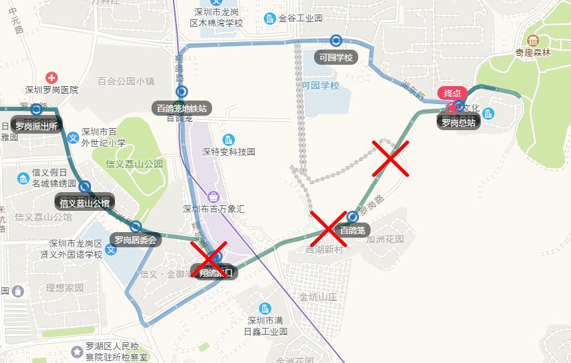 取消站点:双方向取消“百鸽笼、翔鸽路口、罗岗居委会、信义荔山公馆、菁华园、信义假日名城”等6对公交停靠站;往椰风路口方向取消“百鸽笼地铁站、百合星城北”等2个单边停靠站。