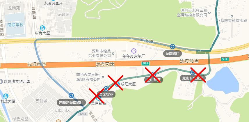 双方向取消“合荣实业、立山环保、龙山永久墓园”等3对公交停靠站,增加“碧新路龙南路口、龙南路口”等2对公交停靠站。