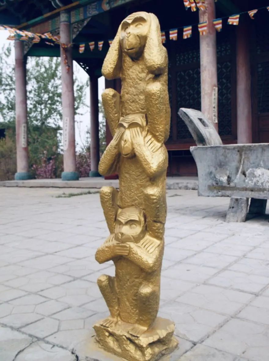 “三不猴”雕塑由三只猴子构成,呈半蹲姿势,模样憨态可掬。第一只用手捂住嘴巴,第二只用手蒙着眼睛,第三只用手捂住耳朵。这三只猴子所代表的是“非礼勿视,非礼勿言,非礼勿听”,即缘自《论语》的儒家文化。