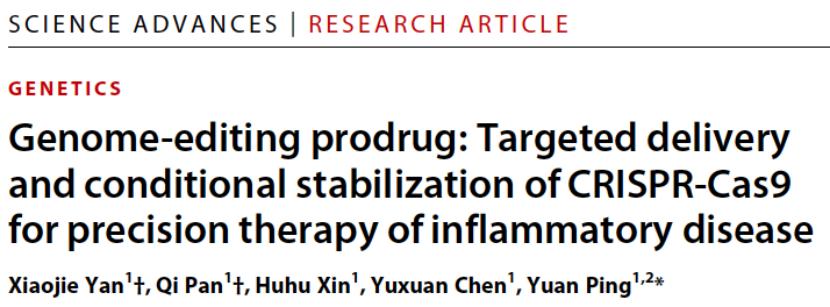 2021 年 12 月 8 日,浙江大学药学院平渊课题组在 Science Advances 期刊发表了题为:Genome-editing prodrug: Targeted delivery and conditional stabilization of CRISPR-Cas9 for precision therapy of inflammatory disease 研究论文。