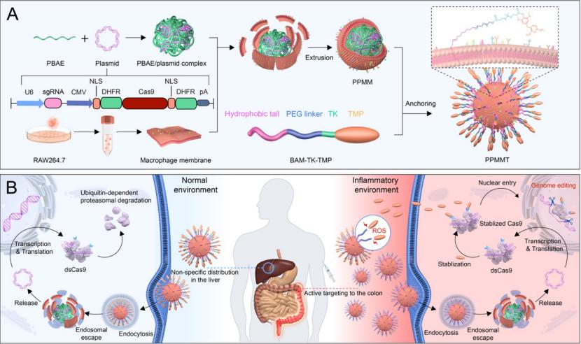 该递送系统通过纳米复合物表面包裹的巨噬细胞膜靶向炎症性结肠组织,微环境响应激活基因编辑工具对结肠组织细胞的 PHD2 基因位点编辑,实现结肠炎的精准治疗。