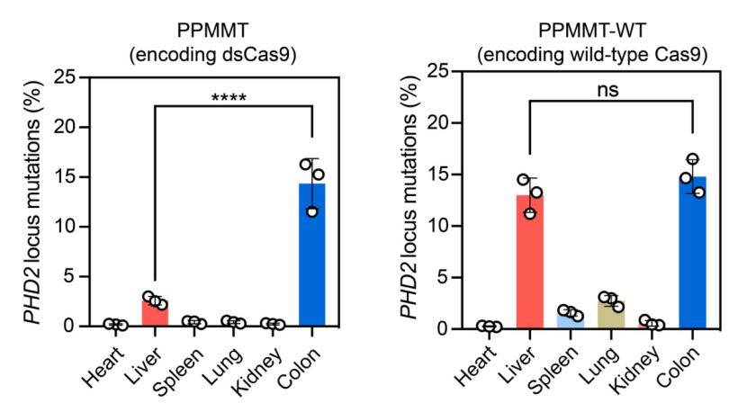 该团队对患有炎症性肠炎的小鼠进行了给药处理,并通过基因深度测序的方法,比较了 NanoProCas9 与野生型 Cas9 在组织水平的基因编辑脱靶效率。结果表明,与野生型 Cas9 相比,NanoProCas9 可以显著降低小鼠肝部、肺部、脾脏等组织的基因编辑,在结肠组织仍有较高的编辑效率(图 2),表现出更高的炎症组织特异性和安全性。