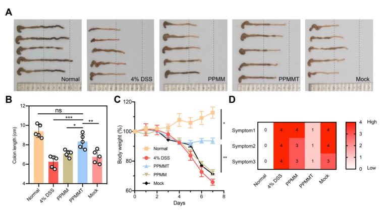 结肠组织的 PHD2 蛋白表达下调,可以保护结肠组织结构完整并降低促炎因子 TNF-α 的表达。此外,纳米复合物中细胞膜上的 TNFR2 受体可以中和 TNF-α,前药分子也可中和部分的 ROS。经治疗后的小鼠结肠炎症状减轻,如结肠长度缩短、体重减轻以及疾病活动指数(DAI)增加等得到抑制(图 3)。
