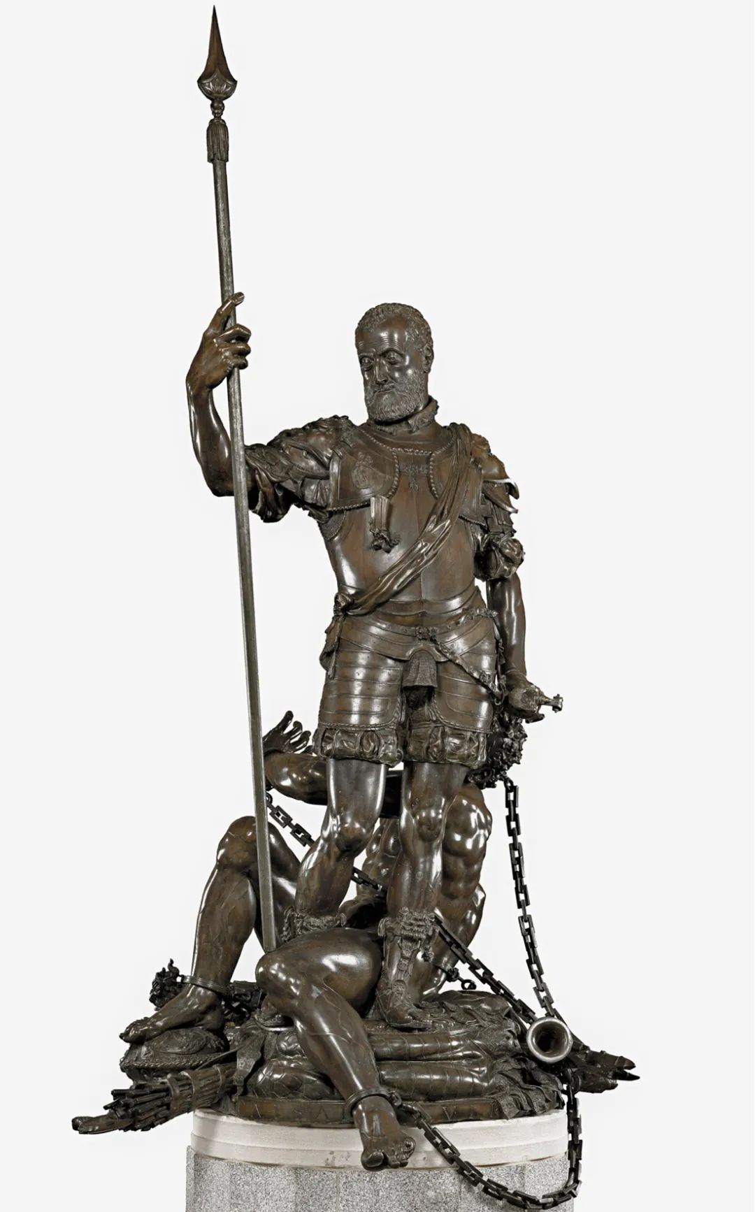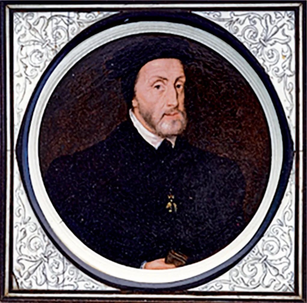 皇帝还努力以更世俗的方式追求不朽。他请画家为自己画像,赞助史书的编纂,请艺术家创作作品,营造宫殿,并在具有宣传意义的盛大典礼中粉墨登场(尤其是“入城式”,见彩图7)。大批量制造的查理五世肖像出现在钱币、勋章、陶瓷甚至跳棋的棋子上,同时也出现在图书和大幅印刷品上。音乐家们谱曲讴歌他取得的成功(帕维亚战役、皇帝加冕礼),有时也记录他受到的挫折(比如他的妻子香消玉殒)。一大群不同国家的诗人、画家、雕刻家、玻璃工匠、印刷商、纺织工、珠宝匠、历史学家、军械匠和书记员争相为他塑造帝王的威仪。皇帝遵照巴尔达萨雷·卡斯蒂廖内的礼仪研究专著《廷臣之书》(这是查理五世最喜爱的书之一,作者出版该书的时候正在皇帝的宫廷担任大使;查理五世下旨将该书译为西班牙文)的建议,无论是行走、骑马、战斗、跳舞还是讲话时,都时刻注意观众的观感。19世纪的西班牙政府打开了查理五世的墓穴,用他赤裸的、已经干尸化的遗体招徕游客,皇帝陛下若是泉下有知,一定会无比震惊。有些游客为他画像,而另一些则拍照,甚至有一名游客贿赂了警卫,折断查理五世的一截手指作为纪念品。不过这种破坏行为带来了一个好处:对这截手指(如今被保存在一个特殊容器内)的医学检查得到了两项重要证据:一是皇帝生前患有慢性痛风(他确实一直抱怨自己的痛风),二是他的直接死因是严重的疟疾。