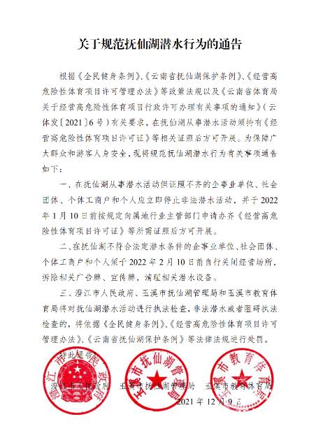 其中规定,在抚仙湖从事潜水活动但证照不齐的企事业单位、社会团体、个体工商户和个人应立即停止非法潜水活动,并于2022年1月10日前按规定向属地行业主管部门申请办齐《经营高危险性体育项目许可证》等所需证照后方可开展。