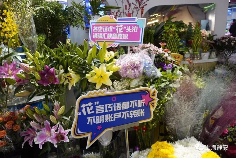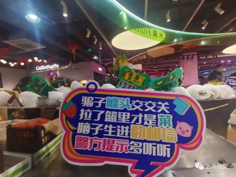 在标语的选择上,静安警方做了精细化设计,将诈骗类别与摊档的销售品种对应,用更接地气的方式,将反诈宣传传递到广大市民,特别是老人和家庭主妇的眼中和心中,营造出“时时提醒、处处提防”的反诈氛围。