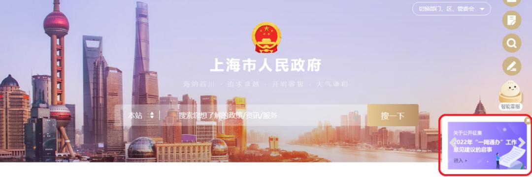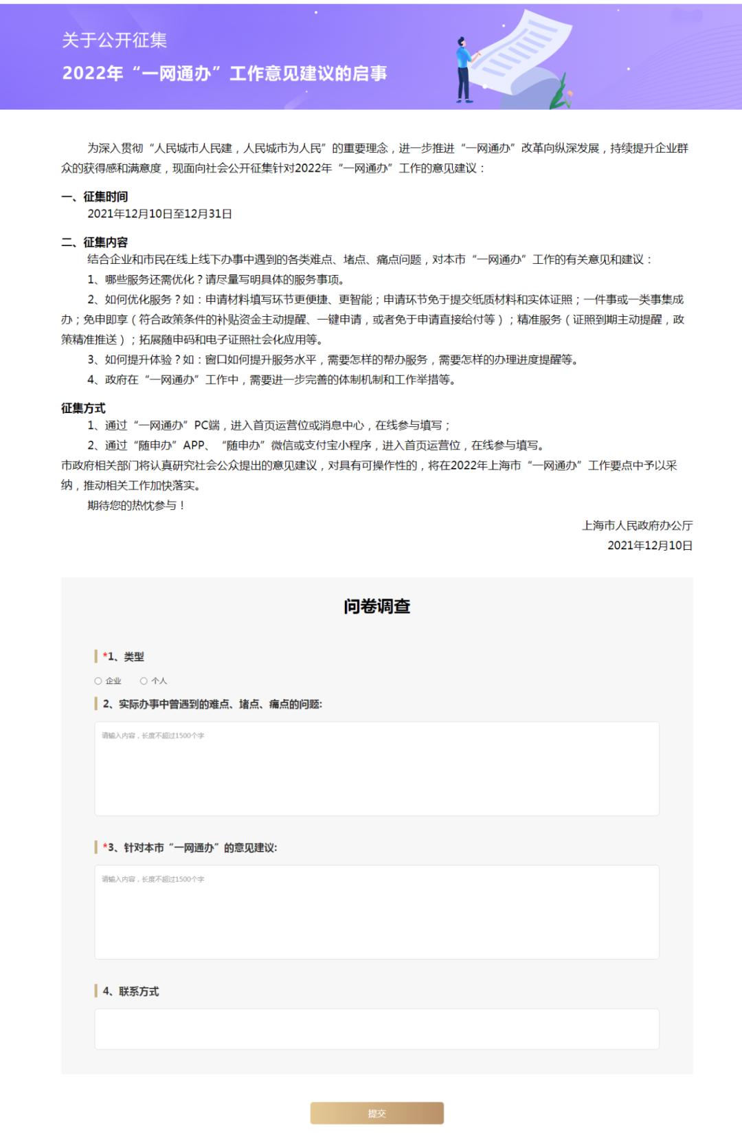 即日起至12月31日,结合企业和市民在线上线下办事中遇到的各类难点、堵点、痛点问题,面向社会公开征集针对2022年“一网通办”工作的意见建议。通过“一网通办”PC端,“随申办”APP、“随申办”微信或支付宝小程序,在线参与填写。您的宝贵建议有可能被市政府相关部门采纳落实噢,快来了解下吧!