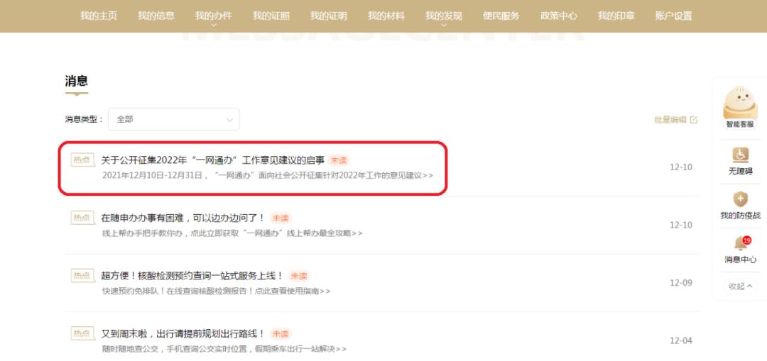 1、通过“一网通办”PC端,进入首页运营位或消息中心,在线参与填写;