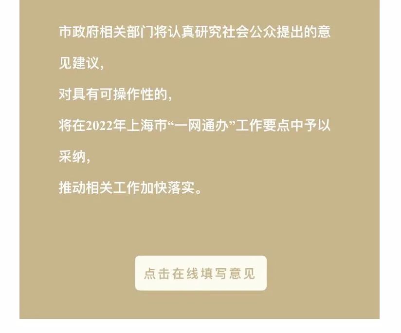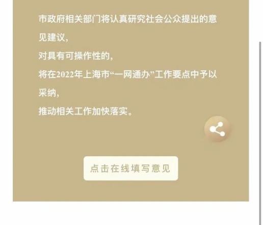 市政府相关部门将认真研究社会公众提出的意见建议,对具有可操作性的,将在2022年上海市“一网通办”工作要点中予以采纳,推动相关工作加快落实。