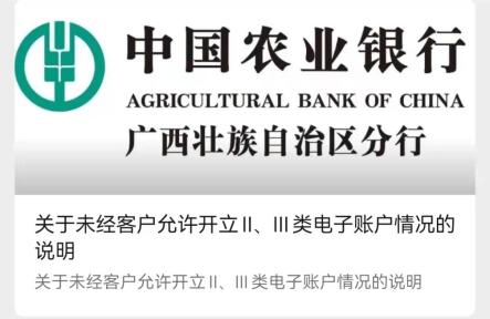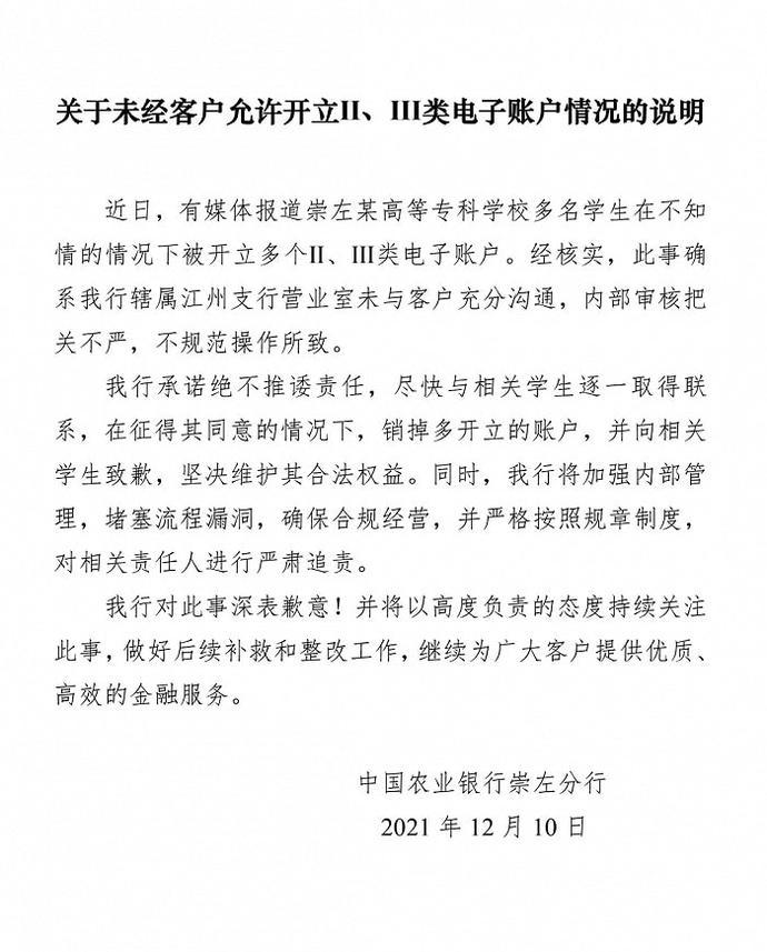 据“中国农业银行广西区分行”微信公众号12月11日消息,中国农业银行崇左分行发布说明,近日,有媒体报道崇左某高等专科学校多名学生在不知情的情况下被开立多个Ⅱ、Ⅲ类电子账户。经核实,此事确系农行辖属江州支行营业室未与客户充分沟通,内部审核把关不严,不规范操作所致。