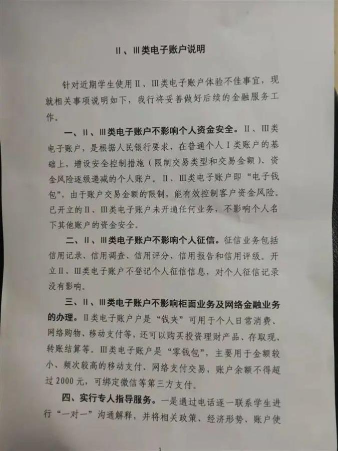 文件对“学生使用Ⅱ、Ⅲ类电子账户体验不佳事宜”作出说明,称Ⅱ、Ⅲ类电子账户不影响个人资金安全和个人征信,也不影响柜面业务及网络金融业务的办理。之后,银行将为“被开账户”的学生提供专人指导服务,“一对一”对接处理账户问题。