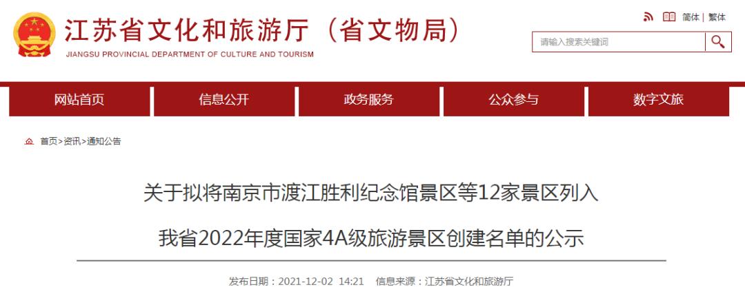 近日,江苏省文化和旅游厅公布了《关于拟将南京市渡江胜利纪念馆景区等12家景区列入我省2022年度国家4A级旅游景区创建名单的公示》。