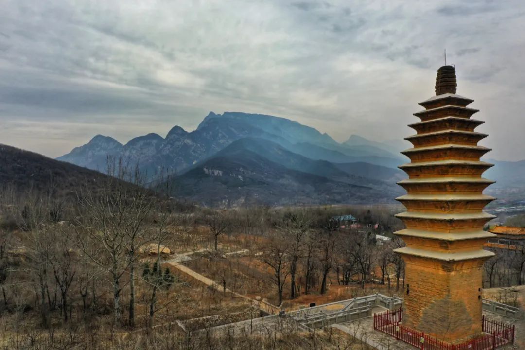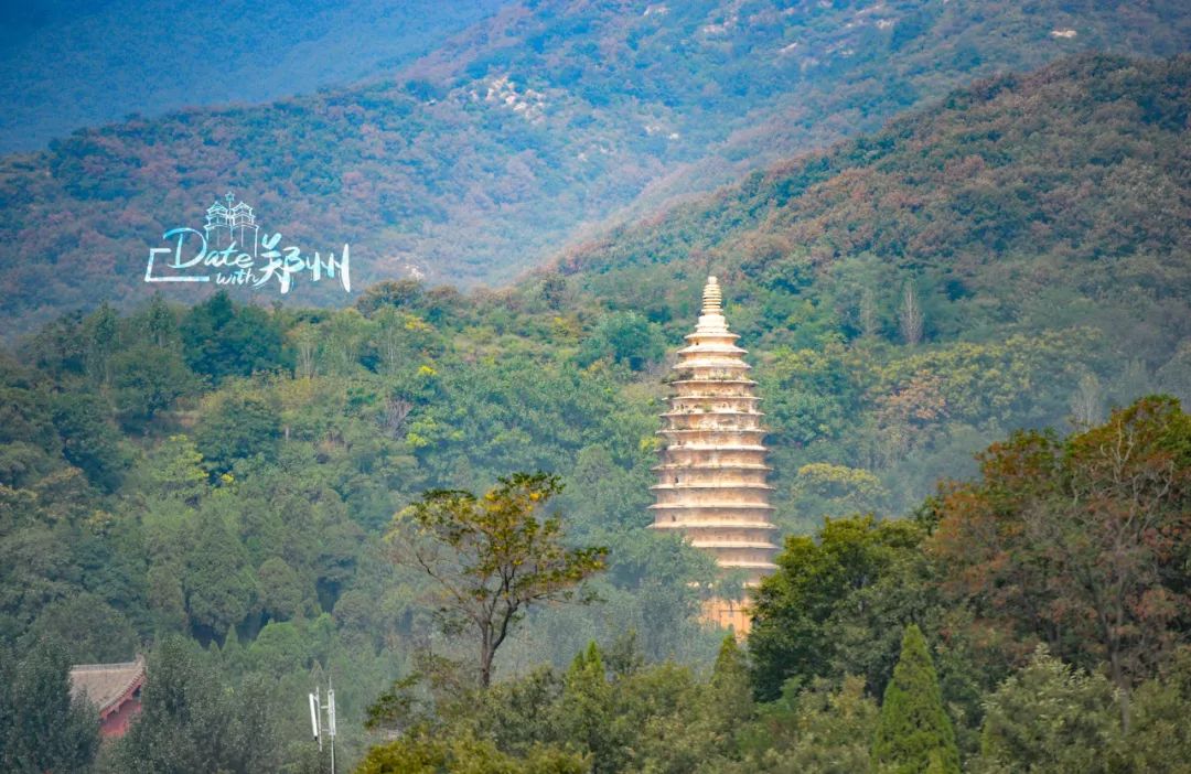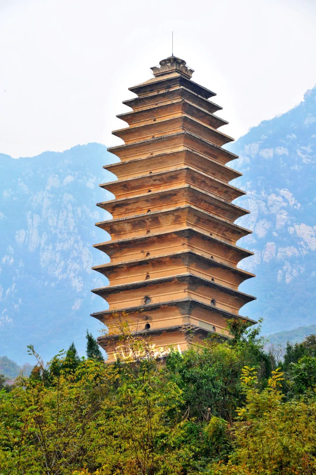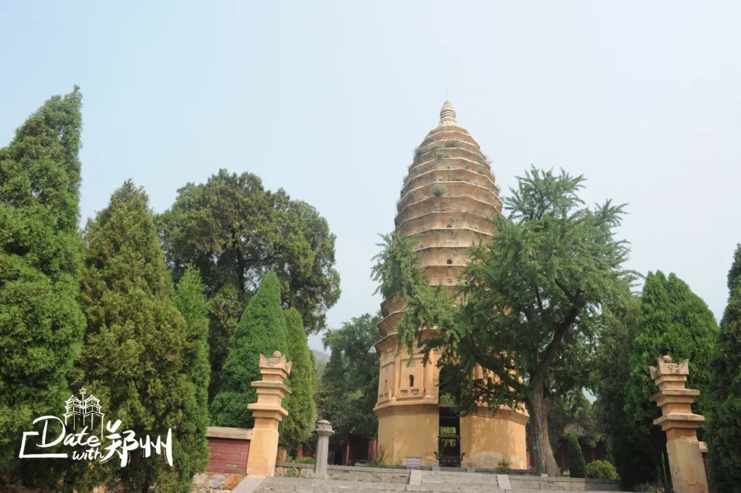 嵩高维岳,向东远眺,嵩岳寺塔从延绵不绝绿海中涌出,与不远处的法王寺塔遥相呼应。白居易曾在《夜从法王寺归嵩岳寺》里写道:“双刹夹虚空,绿云一径通”。
