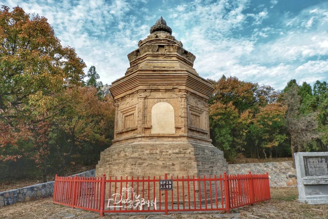 净藏禅师塔位于嵩岳太室山南麓积翠峰下,该塔创建于唐天宝五年,以砖代木,除塔刹为石雕外,全由青砖砌筑,是我国现存最早的八角形仿木结构砖塔。