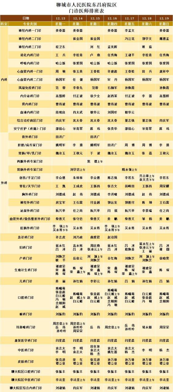 原标题:《【聊城市人民医院东昌府院区】12月13日-12月19日专家门诊表》