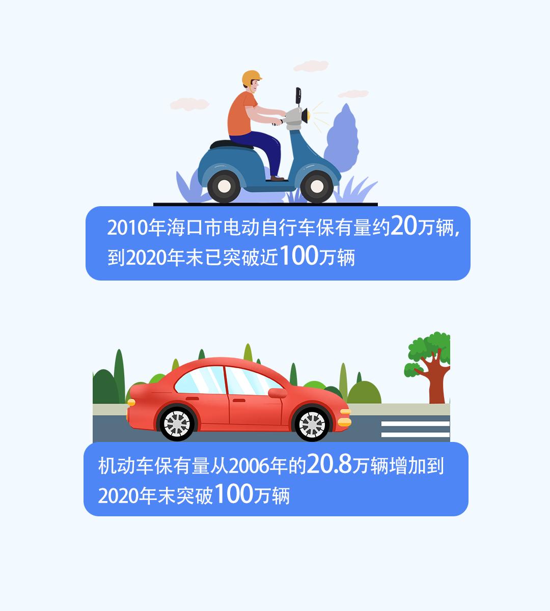 私家车和电动自行车数量增涨过快。据了解,2010年海口市电动自行车保有量约20万辆,到2020年末已突破近100万辆。机动车保有量从2006年的20.8万辆增加到2020年末突破100万辆。海口市常住人员287万人,除去步行、自行车等出行方式以外,公交出行人群占比极低。