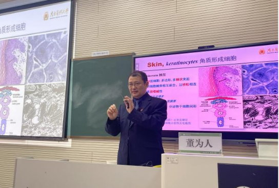 董为人教授首先详细解读了“绪论”在课程教学中的重要性,一堂好的“绪论”课能引导学生了解本课程的基本内容、与本学科的关系及与其他已学课程和后续课程之间的关系,启发和培养学生浓厚的学习兴趣,建立起系统化概念。通过绪论的学习,达到师生感情交流,使学生建立起学习本课程的良好心理环境,这对全课程的教学将会起到非常重要的作用。接着,董为人教授以《组织学•绪论》中的小肠为例进行了示范教学,巧妙地将思政元素与专业课程进行了深度融合,达到了“在教师引导下的学生自主思考”的良好效果,为大家展示了一堂内容丰富、生动精彩的示范课。