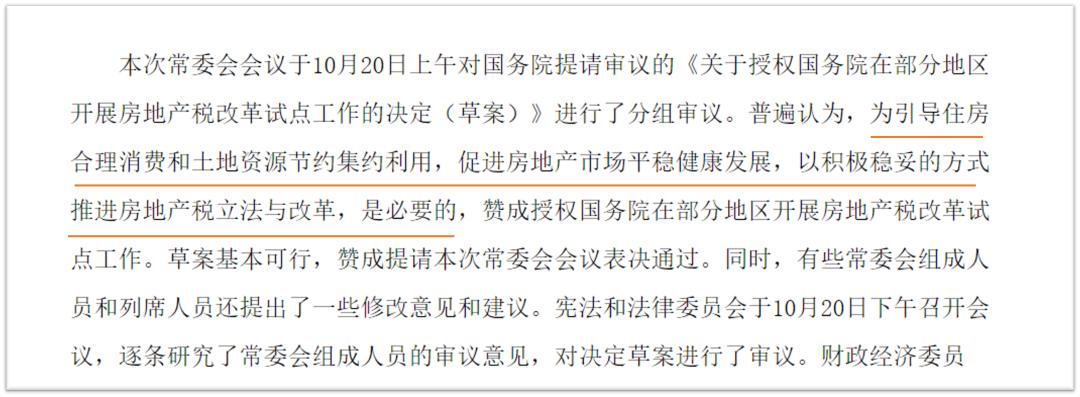 “进一步深化房地产税改革试点,可以发挥试点对整体改革的示范、突破、带动作用,强化房地产调控需求侧管理,稳定市场预期,也为今后全国统一立法积累经验、创造条件。”