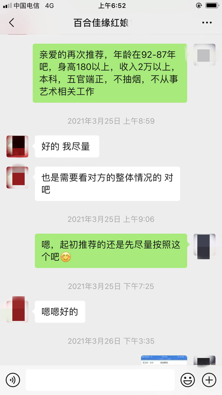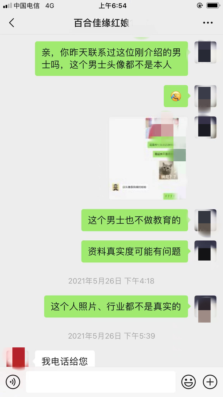 第二次发现有问题的过程则更加戏剧性,“红娘给我推荐了一个男生,我看资料还可以,就说可以加个微信。”没想到拿到联系方式后,小张才发现这位男士竟然是自己相熟的一位男性朋友,“资料里写的他父母双全,其实他的父亲已经不在了。”她说,要不是自己和对方早就相识,根本发现不了这个问题。