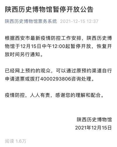 根据西安市最新疫情防控工作安排,陕西历史博物馆于今日(15日)中午12:00起暂停开放,恢复开放时间另行通知。已经网上预约的观众,可以通过原预约渠道自行申请退票或拨打4000293806咨询处理。