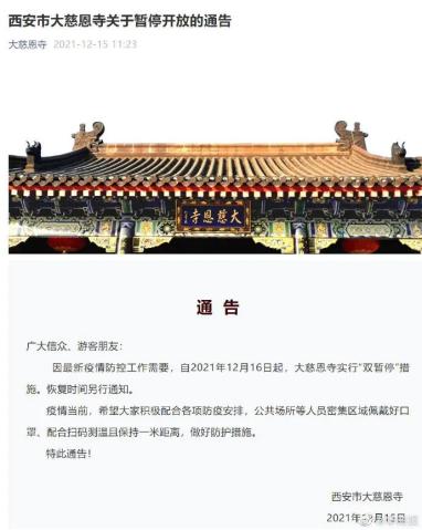 因最新疫情防控工作需要,自2021年12月16日起,大慈恩寺实行“双暂停”措施。恢复时间另行通知。疫情当前,希望大家积极配合各项防疫安排,公共场所等人员密集区域佩戴好口罩、配合扫码测温且保持一米距离,做好防护措施。