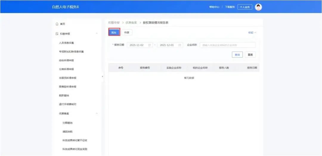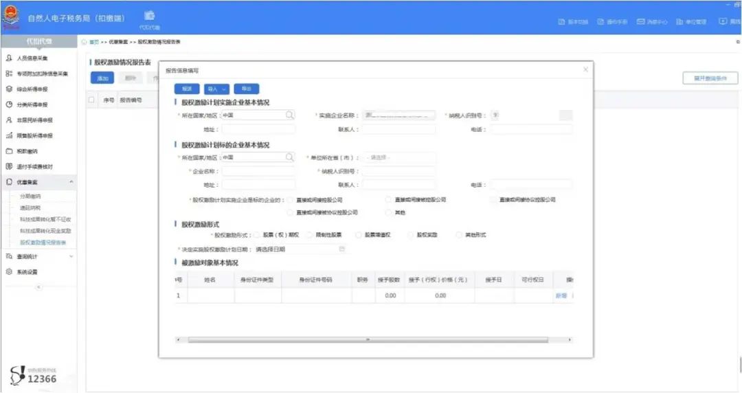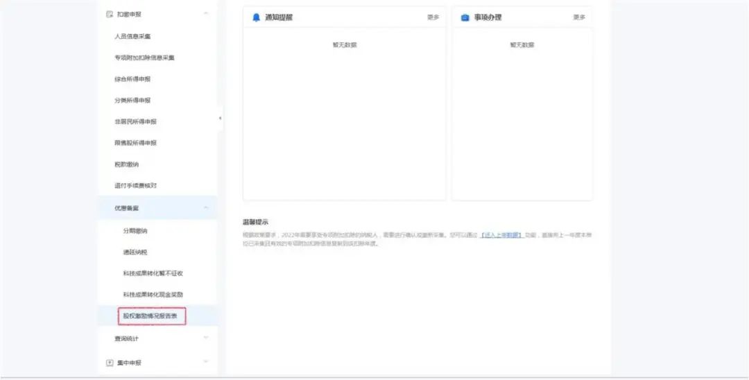 1.打开自然人电子税务局(扣缴端)-点击左侧【优惠备案】-【股权激励情况报告表】