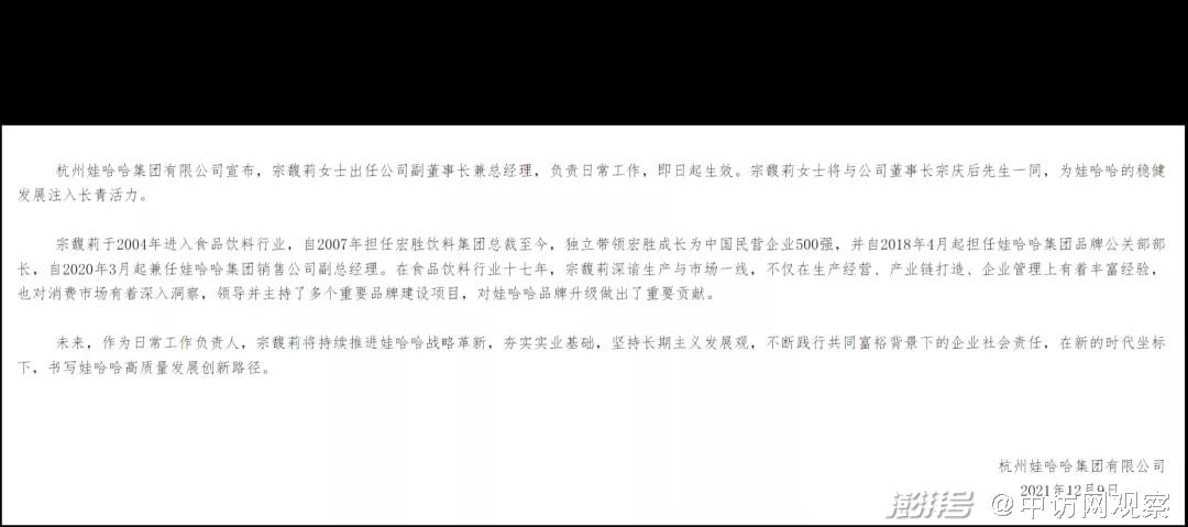 从官网公告可以看出,宗馥莉得到了宗庆后的认可,正式成为了公司的“二把手”。