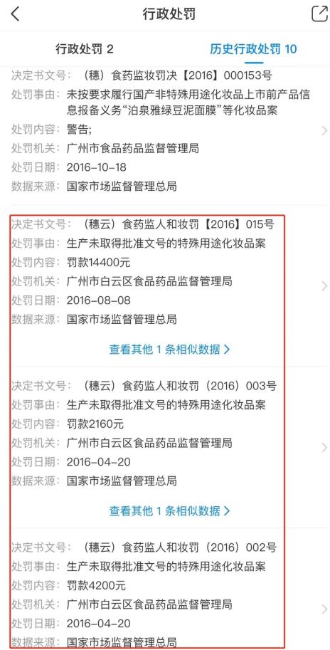 根据国家企业信用信息公示系统信息,广州欧博化妆品有限公司此前因销售未取得备案的化妆品被行政处罚。