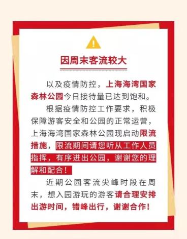 从12月12日起,上海海湾国家森林公园将启动实施限流措施,前来公园的小伙伴务必要听从工作人员的指挥,遵守公共秩序,有序进出,做好自身的防疫措施,主动配合工作人员,查看健康码等,谢谢大家的配合。