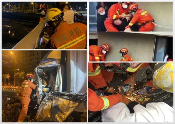 12月5日凌晨4时58分,湖里区机场北环路万翔物流路口,一辆货车撞上路边绿化带,寨上消防救援站和高崎小型消防救援站15分钟的成功救援被困司机……