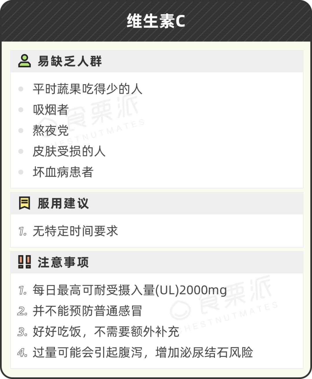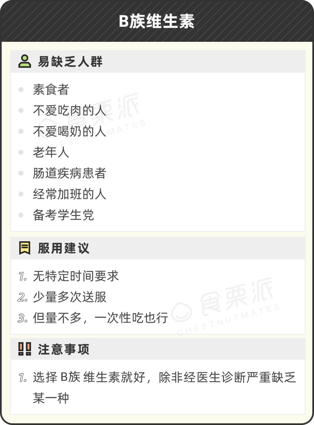 ● 维生素C、B族维生素等水溶性维生素,任何时间段服用皆可,最好分次服用。但由于该类产品一般剂量小,一次性服用问题不大;