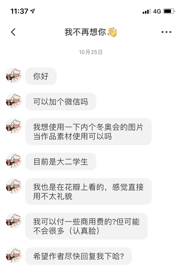 “你好,可以加个微信吗?我想使用一下冬奥会的图片当作作品素材……”10月25日,插画设计师树一在其社交平台收到了这样一条私信,对方表示自己目前是大二学生,在图库中看到了树一设计的冬奥会海报图片,希望能将其当作素材使用。对方还表示,他可以支付一些商用费用,但可能不会很多。