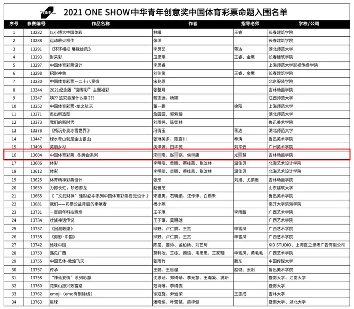 12月8日,上述公众号公示了入围名单。在“中国体育彩票命题”入围名单一栏可以看到,参赛编号为13604的“中国体育彩票—冬奥会系列”赫然在第16号,其作者是宋某、赵某、侯某,指导老师为尤某,学校为吉林动画学院。而这款入围作品的插画原作者,正是树一本人。