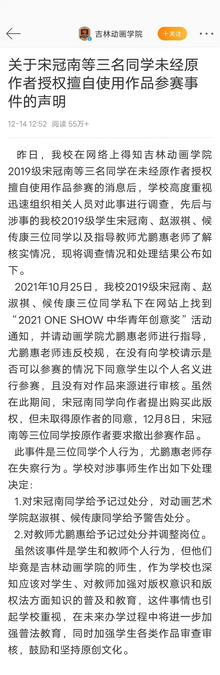 随后,新黄河记者致电吉林动画学院,相关负责人介绍,学校目前已针对此事进行处理,相关处理结果也已对外公布。新黄河记者注意到,吉林动画学院官方微博于12月14日中午发布了《关于宋冠南等三名同学未经原作者授权擅自使用作品参赛事件的声明》。