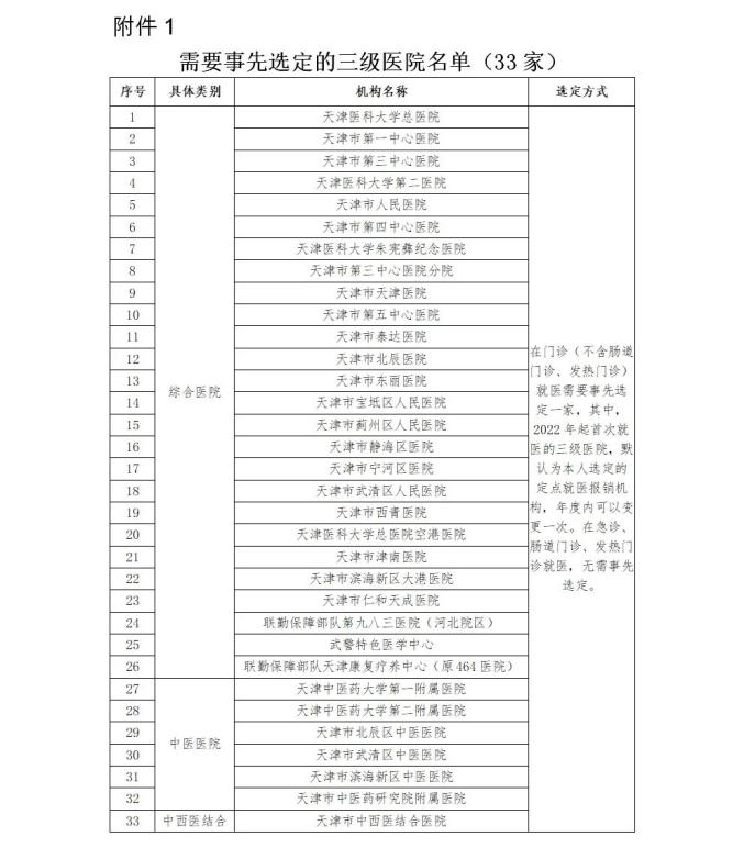 参保居民在本市三级综合医院、中医医院、中西医结合医院(共33家,见附件1)的门诊(不含肠道门诊、发热门诊)就医,需事先选定一家医院,方可刷卡报销。其中,2022年起首次就医无需办理手续,首次就医三级医院将默认为本人第一次选定的定点就医报销机构,年度内可以变更一次。