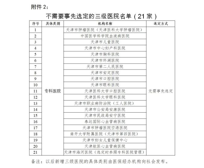 参保居民在本市三级综合医院、中医医院、中西医结合医院的急诊、肠道门诊、发热门诊以及在本市三级专科医院(含海河医院,共21家,见附件2)门(急)诊就医,无需事先选定一家作为定点就医报销机构,可以直接刷卡报销。