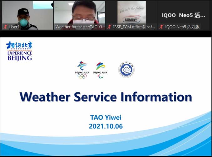 预报员陶亦为参加在线召开的领队会,英文介绍天气趋势。