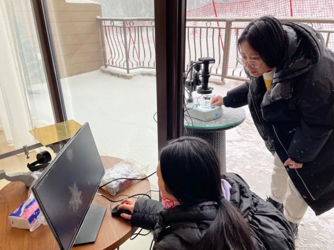 张家口赛区气象服务团队队员用显微镜观测降雪粒子,记录每一片雪花的形状。 图/张晓瑞