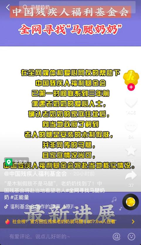 12月14日,中国残疾人福利基金会的账号发布视频,全网寻找“马腿奶奶”,恳请网友转发视频并提供信息,基金会将第一时间给予救助。